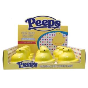 he iconic Peeps chick shape, now a candy-filled tin! The tin is filled with 1.0 ounce of Peep flavored chick-shaped candy. Packed 9 per display.