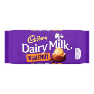 Cadbury Dairy Milk milk chocolate with whole hazelnuts.