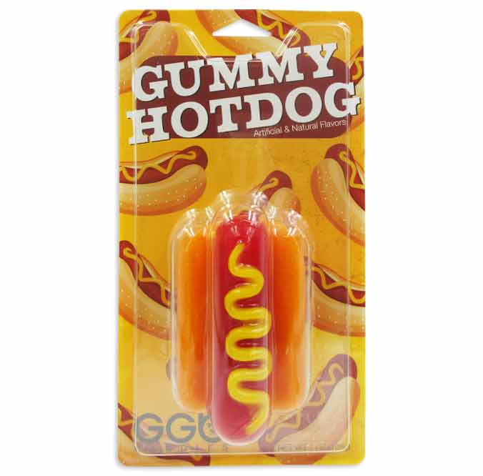 Hot dogs! Get your hot dogs here! We made this American classic gummy original layered in delicious fruity flavors. This made-in-the-USA Gummy Hotdog is 4 1/2” x 2 1/2” and approximately 7oz.
