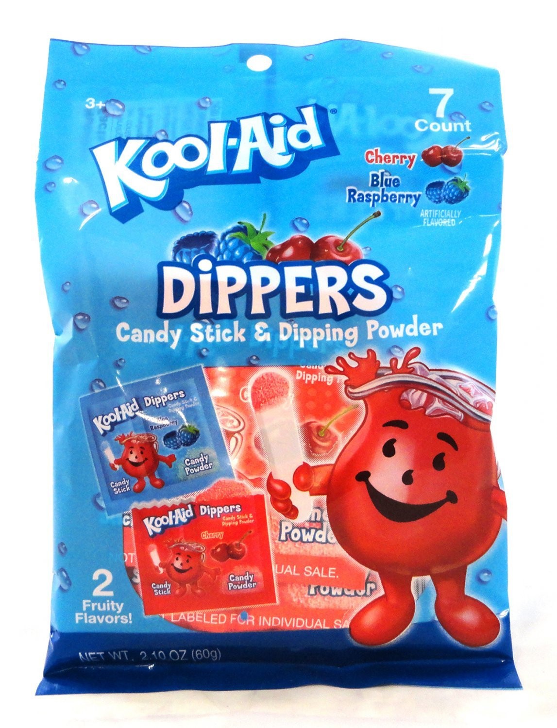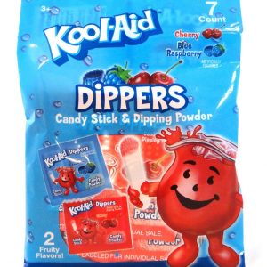 Kool-Aid 7ct. Dipping Candy Peg Bag – 7 Mini Pouches of Kool-Aid Powder + Kool-Aid Candy Stick in Mini Fun-Size Pouches in either Blue Raspberry or Cherry flavors. 2.10oz.of candy per peg bag. Packed 2 x 12ct. master cases.