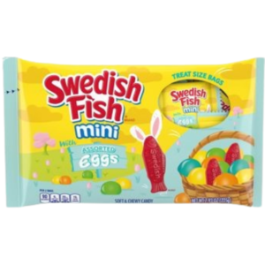 SWEDISH FISH Mini with Assorted Eggs Soft & Chewy Easter Candy is a fun sweet snack to share and enjoy this Easter season. This assortment of gummy snacks is a mix of bite-sized SWEDISH FISH and little eggs in orange, lemon, lime and SWEDISH FISH flavors. Keep these snack packs on hand for Easter egg hunts and Easter baskets this season.