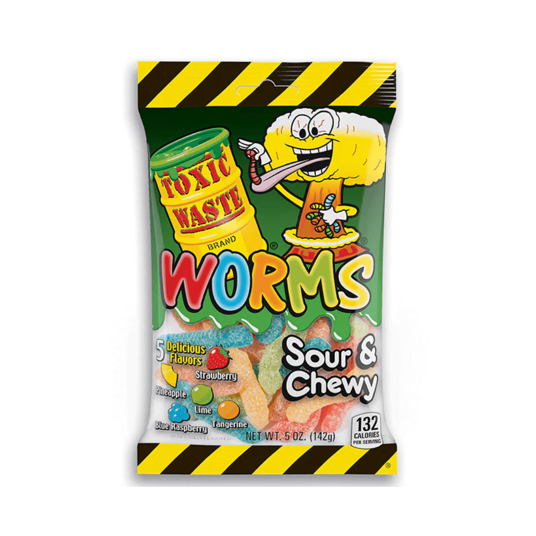 Toxic Waste Sour & Chewy Worms Assorted packs a mighty punch of fruity flavours. Flavours include strawberry, pineapple, lime, tangerine, and blue raspberry. Toxic Waste Sour & Chewy Worms Assorted gummy candy are sure to satisfy sour cravings.